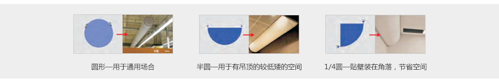 1/4圓形:四分之一圓形布袋風管可以附著于墻角及墻壁四周。適用于低吊頂、室內標高較低的場所。