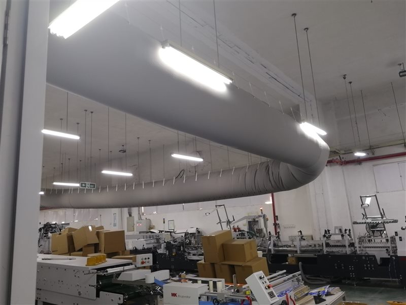 3、懸掛式裝置既省時又美觀:運用雙鋼索吊裝方式,整套管道保持平齊,鼓風飽滿,可定制顏色與車間整體色調相協調。