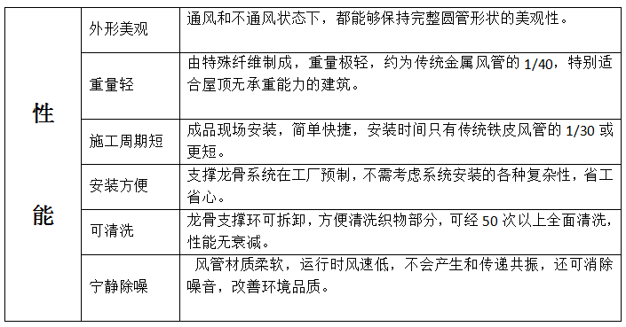 是以全滲透的阻燃纖維布面或不燃滲透布面為基材加上高性能特殊材料制成的龍骨支撐的風(fēng)管產(chǎn)品,制冷暖通上對風(fēng)管外形美觀有需求時被選用的形式。因其在不通風(fēng)狀態(tài)下,也可保持完整圓管形狀,滿足了部分工程上美觀度的要求。支撐R型系列產(chǎn)品達(dá)到國家建筑材料防火等級B級和A級標(biāo)準(zhǔn),可應(yīng)用在各類普通防火場所和特殊防火場所。